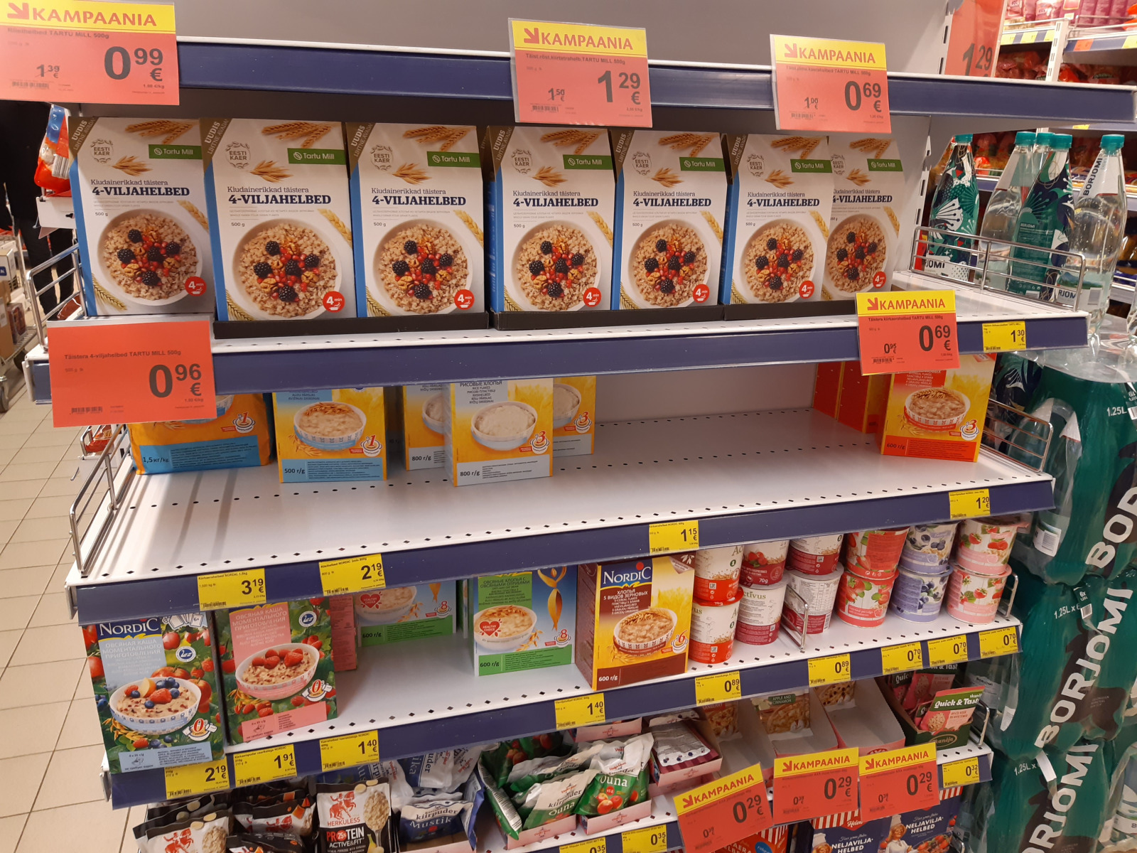 COOP Elva kaubakeskuses oli rahvast kassajärjekorras suht vähe aga kärudes olevad kaubakogused suured. Siingi andsid tooni kõiksugu tangained, makaronid,helbed ja konservid. Pikaajalise säilivusega kaup. Üllatavad oli COOP-i poes konservide riiulitel valitsevad augud. Rahvas ostab purgisuppe. Peaaegu ära olid ostetud jahu ja makaronid. Elva Uudiseid üllatas lihalett. See meenutas 1990-91. aastat.